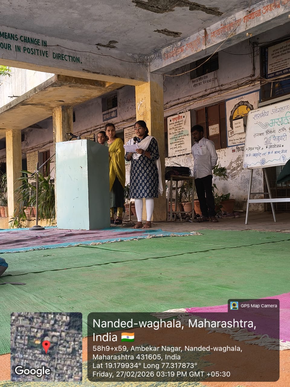 आज दिनांक 27 फेब्रुवारी 2026 रोजी थोरकवी,साहित्यिक ,कथाकार ,ज्ञानपीठ पुरस्कार विजेते वि वा शिरवाडकर यांची जयंती मराठी भाषा गौरव दिन म्हणून साजरी करण्यात आली.या प्रसंगी प्रशिक्षणार्थ्यांनी मराठी भाषेचे महत्व ,चारोळ्या ,गीत ,कविता ,पोवाडा ,भित्तीपत्रके ,नाटिका इत्यादींच्या माध्यमातून व्यक्त केले,महाविध्यालायाचे प्रा. डॉ गोविंद भुसारे यांनी मराठी भाषा गौरव दिनाचे महत्व सांगितले तर महाविद्यालयाचे प्राचार्य डॉ उर्मिला धूत यांनी कार्यक्रमाचा आढावा घेऊन कवी विवा शिरवाडकर यांचे मराठी भाषेतील योगदान यावर मार्गदर्शन केले (Marathi Bhasha Gaurav din has celebrated with various activities by teacher trainee on dated 27 February 2026)