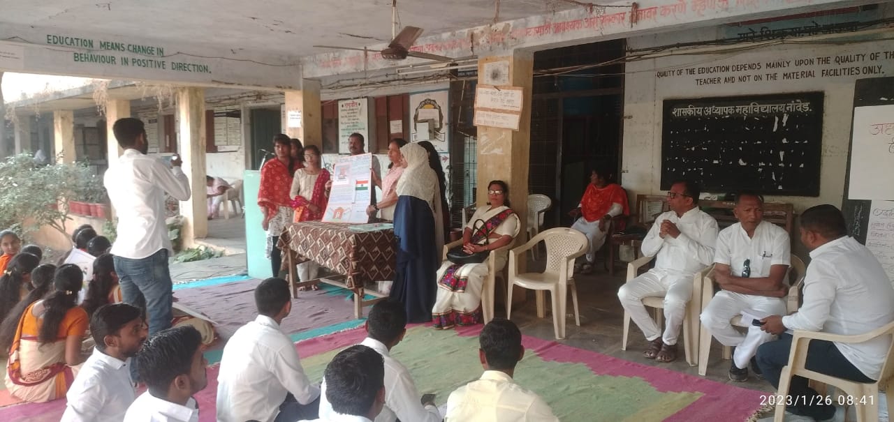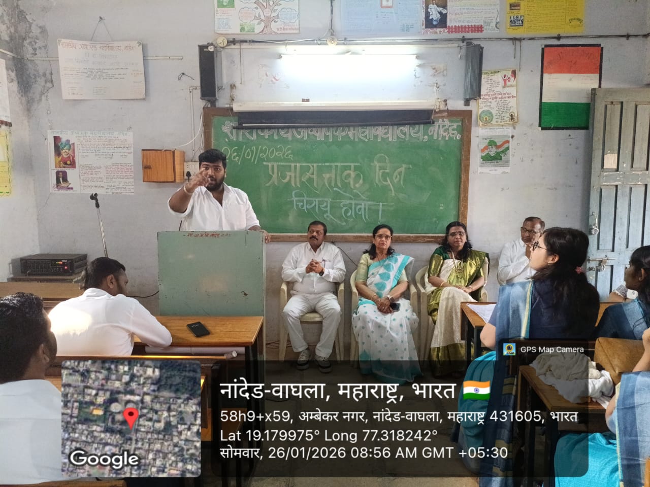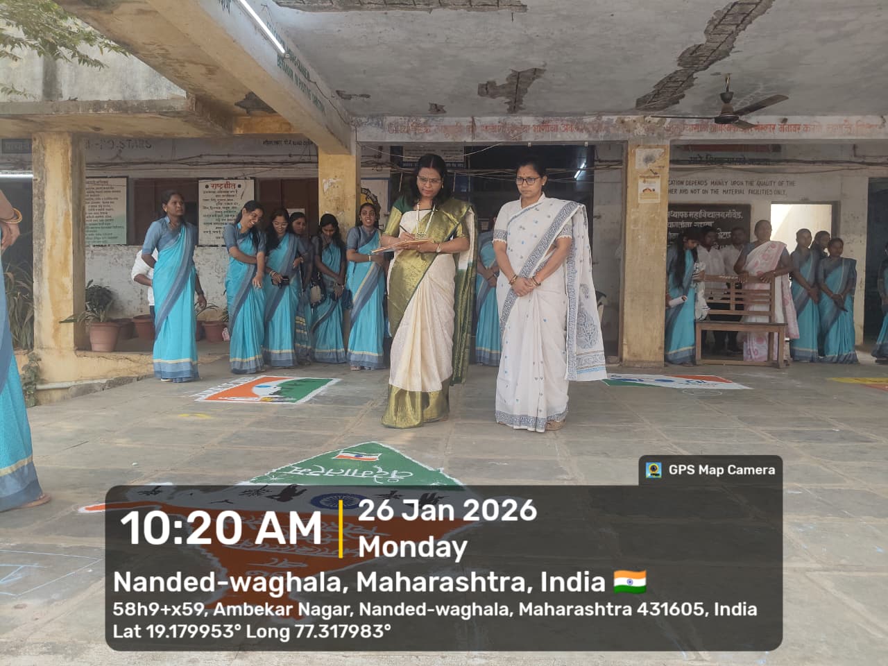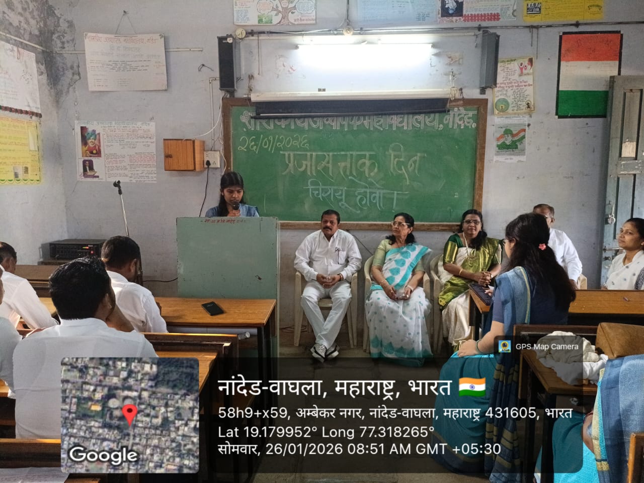 आज दिनांक 26 जानेवारी 2026 रोजी सकाळी 7.45 वाजता महात्मा गांधी व डॉ बाबासाहेब आंबेडकर यांची प्रतिमा पूजन करून सकाळी 8.00 वाजता ध्वजा वंदन करण्यात आले या प्रसंगी राष्ट्रगीत संविधान प्रास्ताविका,राज्य गीत गायन झाले.महाविद्यालयाच्या प्राचार्य डॉ उर्मिला धूत यांनी प्रजासत्ताक दिनानिमित्य मार्गदर्शन केले ,प्रशिक्षणार्थ्यांनी नेताजी सुभाष चंद्र बोस व प्रजासत्ताक दिन विषयावर तयार केलेली भित्ती पत्रके प्रकाशित करण्यात आली ( celebrated Republic Day with on 7.45 a m worships of idols of Mahatma Gandhi & Dr Babasaheb Ambedkar ,on 8.00 a m flag vandan, by singing Rashtra Geet,preamble, Rajya Geet. On this occasion College principal Dr Urmila Dhoot has expressed her patriotic thoughts & guided, Wallpapers prepared by teacher trainee has published.)