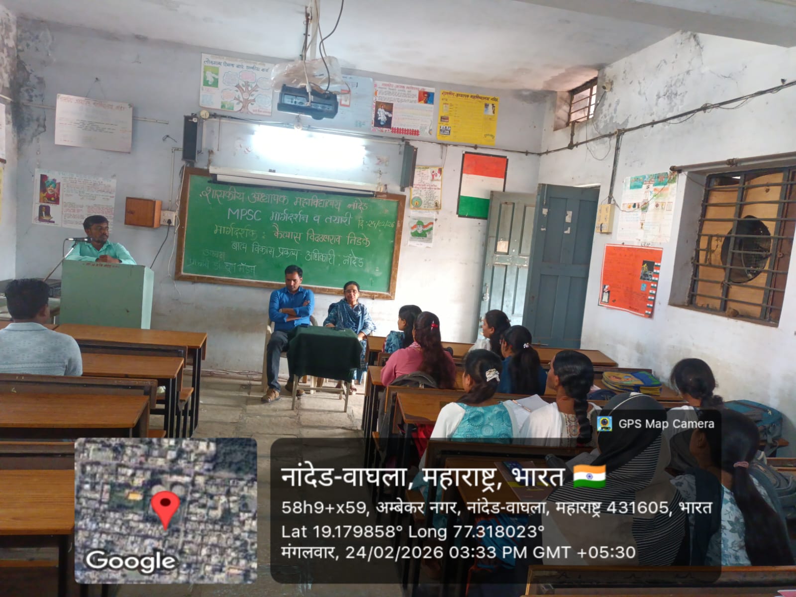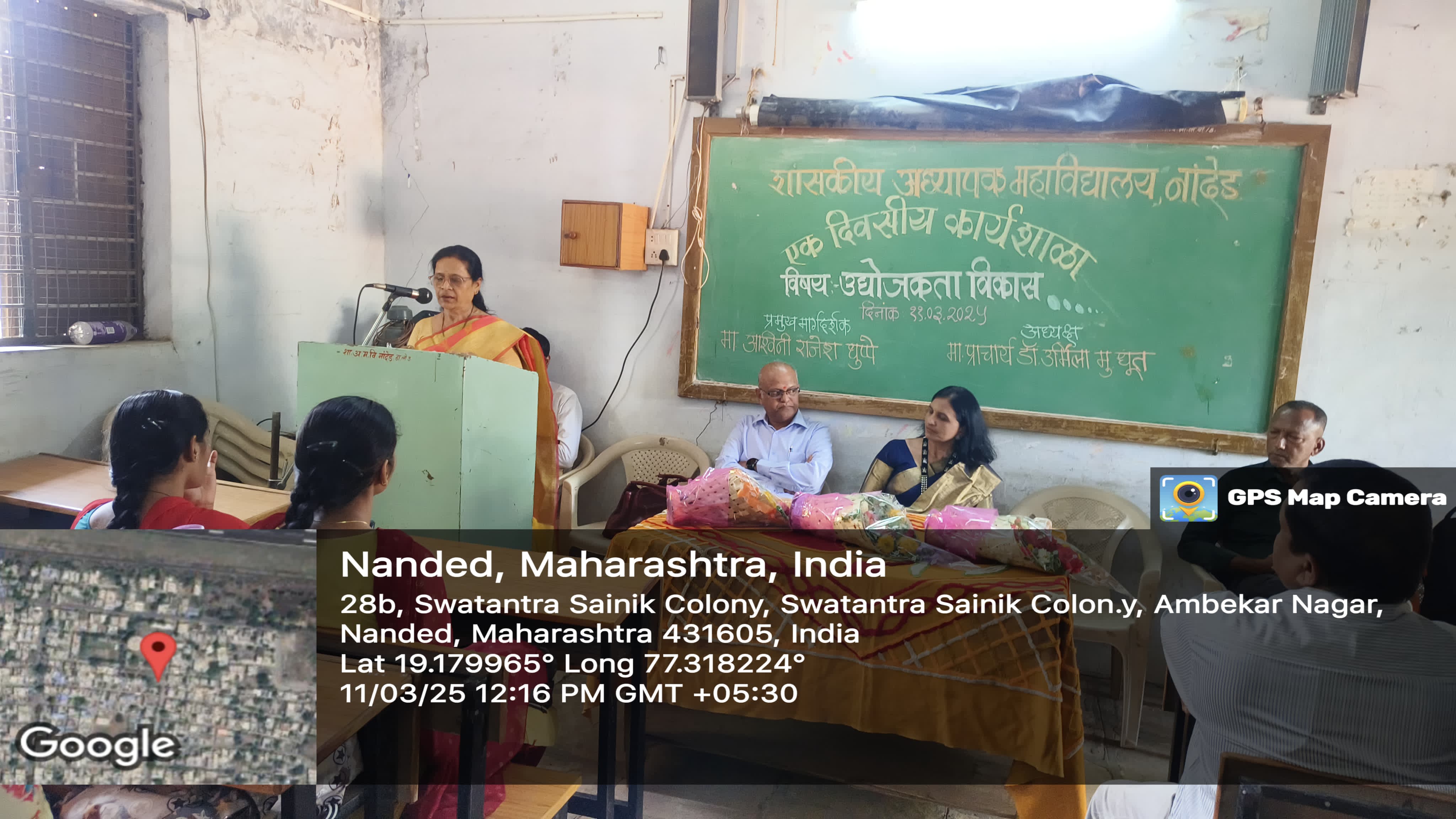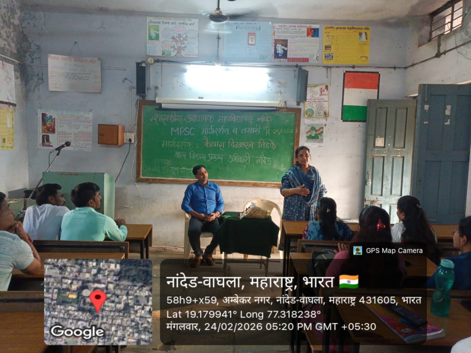 आज दिनांक 24 फेब्रुवारी 2026 रोजी महाविद्यालयात. एम पी एस सी. परीक्षा व तयारी या विषयावर एका दिवसाची कार्यशाळा घेण्यात आली.श्री कैलास विठ्ठल तिडके,जिल्हा बाळ विकास प्रकल्प अधिकारी,नांदेड यांनी द्वितीय वर्षाच्या प्रशिक्षणार्थ्यांना एम पी एस सी(MPSC) परीक्षा व तयारी या बाबत चे मार्गदर्शन केले .या वेळी महाविद्यालयाच्या प्राचार्य डॉ उर्मिला धूत यांनी प्रशिक्षणार्थ्यांनी स्पर्धा परीक्षांचा अभ्यास करावा या बाबत उदबोधन केले ( one day work shop for 2nd year teacher trainee has organised on MPSC exams & preparation . Dist Bal Vikas project offer Nanded Shree Kailash Vitthalrao Tudke has guided to teachertrainee .College principal Dr Urmila Dhoot oriented to teacher trainee about awareness of MPSC exam on dated 24 February 2026)