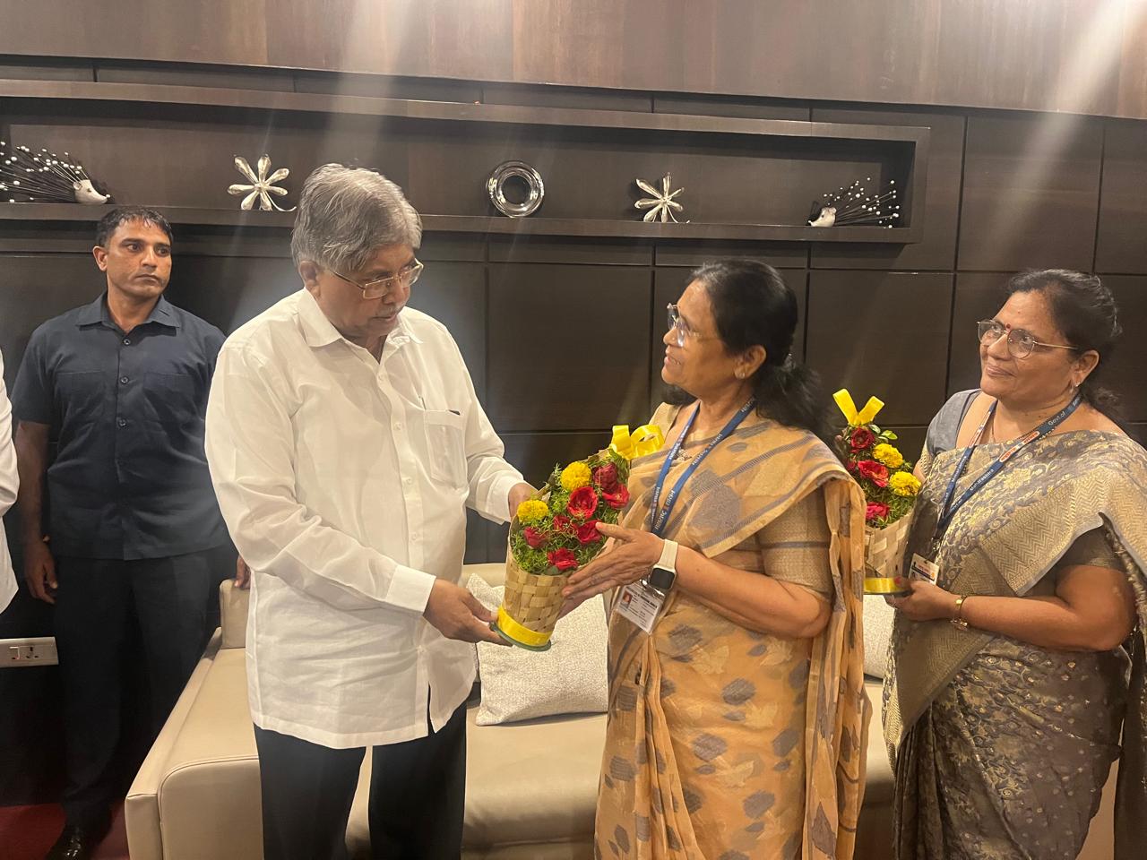 आज दिनांक 19 सप्टेंबर 2025रोजी मा. उच्च व तंत्र शिक्षण मंत्री चंद्रकांत दादा पाटील यांचे नांदेड येथे आगमन,विश्राम भवन येथे मा . दादांचे महाविद्यालयाचे प्राचार्य डॉ उर्मिला धूत स्वागत करतांना(Welcome to Honourable Education Minister Chandrakant Dada Patil at circuit house by College Principal Dr Urmila Dhoot on dated 19 September 2025 ))