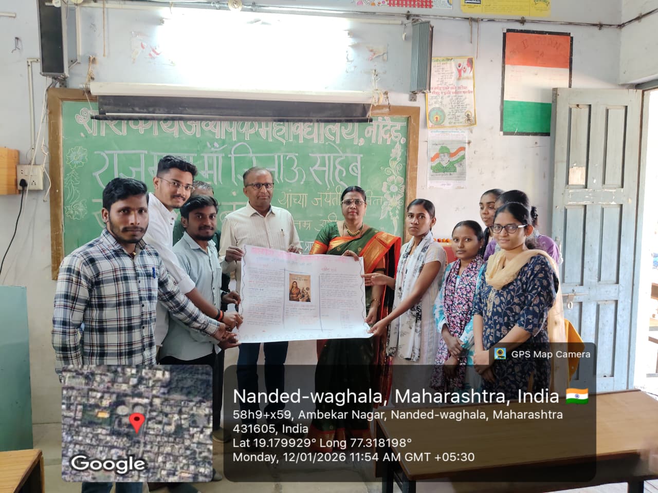 आज दिनांक 12 जानेवारी 2026 रोजी माँसाहेब जिजाऊ व स्वामी विवेकानंद यांची जयंती कॉलेज मध्ये प्रथम वर्षाच्या प्रशिक्षणार्थ्यां सोबत साजरी करण्यात आली . या प्रसंगी प्रशिक्षणार्थ्यांनी माँ साहेब जिजाऊ व स्वामी विवेकानंद यांच्या जीवन कार्यावर भित्ती पत्रके प्रकाशित करण्यात आली (Celebrated Masaheb Jijau & Swami Vivekanand Birth Anniversary with first year students on dated 12 January 2026 ,on this occasion students prepared wall papers on life work of Masaheb Jijau & Swami Vivekanand)