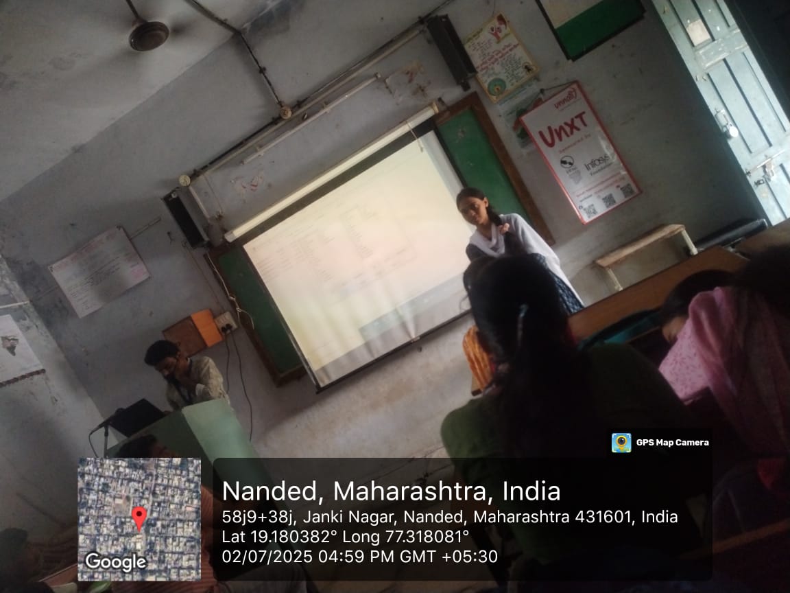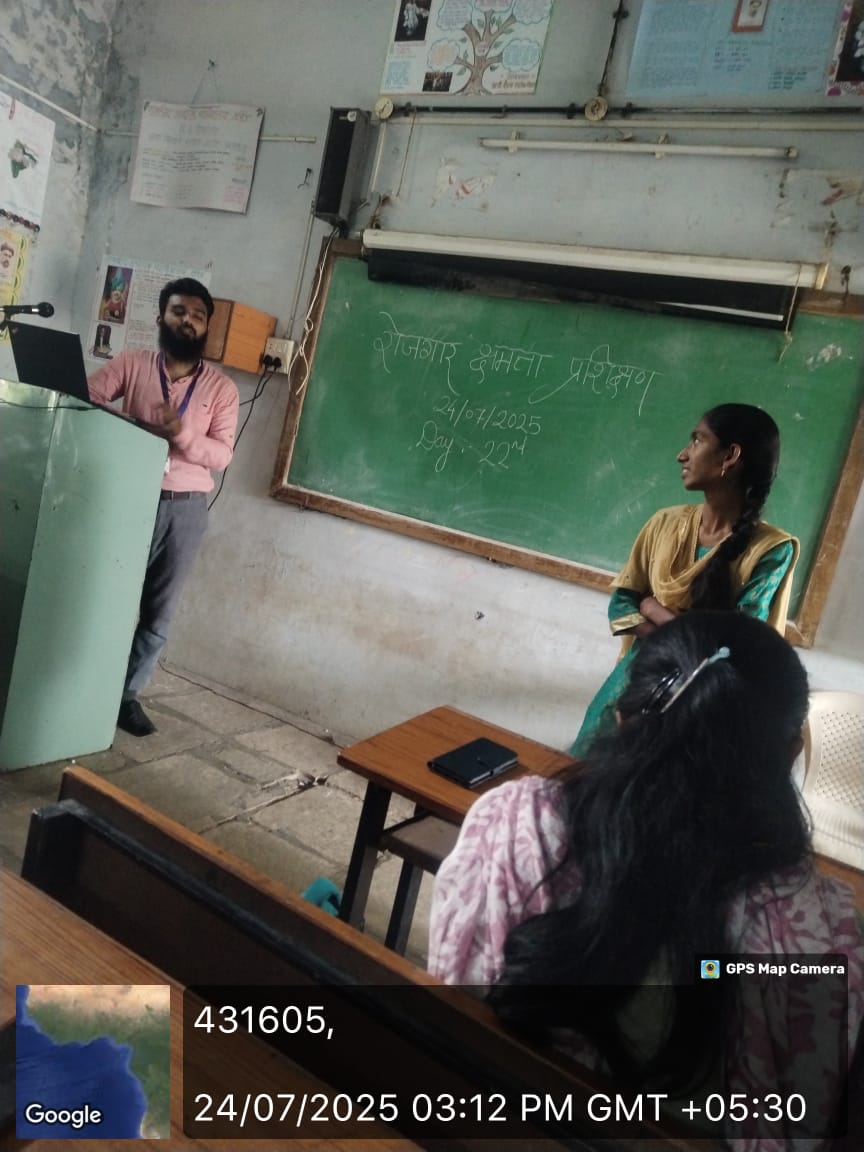 दिनांक 5ऑगस्ट ते 8ऑगस्ट महाविद्यालयात स्व ची जाणीव या विषयावर कृती सत्र आयोजित करण्यात आले ,आज तिसरा दिवस निमंत्रित तज्ञ डॉ स म साखरे ppt माध्यम द्वारे विकासाचे टप्पे आणि विकास प्रक्रिया या विषयावर मार्गदर्शन करताना दिसत आहे (4days program from 5 August to 8 August 2025 on self understanding is organised. On 3rd day guest Expert Dr SM Sakhare teach to students with ppt presentation on development & development stages & practical)